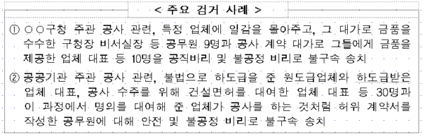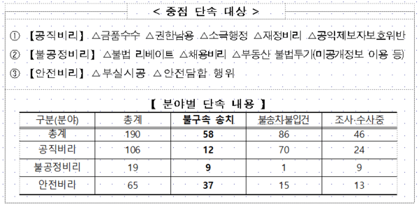 우선, 분야별 상세 단속 내용을 살펴보면 ①공직비리는 ▵재정비리 73명(송치 4) ▵금품수수 23명(송치 7) ▵권한남용 10명(송치 1) 총 106명이고, ②불공정비리는 ▵불법 리베이트 19명(송치 9), ③안전비리는 ▵부실시공 62명(송치 37) ▵안전담합 3명(수사중 3) 총 65명으로 확인되었다.